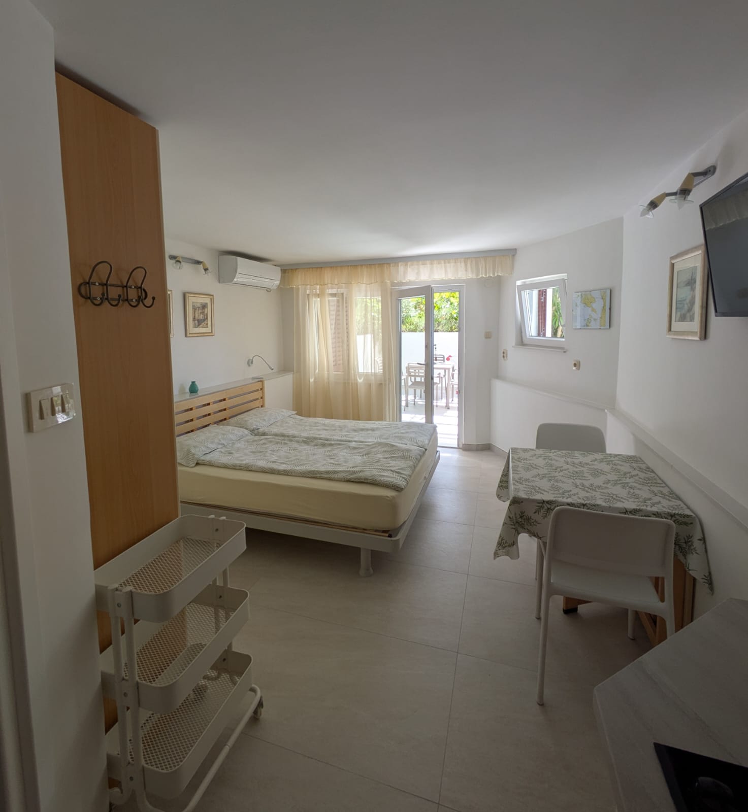 This is a small, but lovely studio on the ground floor. It has private terrace and is perfect for couples. The studio has 25 m2 and comprises of a bedroom with a double bed, a bathroom with shower/WC, a fully equipped kitchen. It also has air conditioning, Wi-Fi, SAT TV, linen and towels which are included into the price, as well as private parking (100 m from the house) and the final cleaning.
